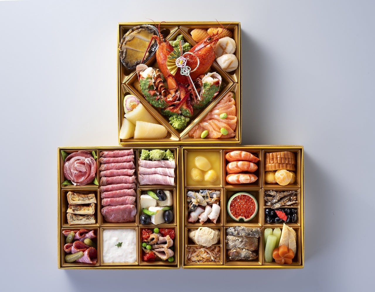 ①安納芋入きんとん②栗甘露煮③海老うま煮④伊達巻⑤海老錦手まり⑥五福なます⑦たこのカルパッチョ⑧いくら醤油漬け⑨田作り⑩丹波黒豆煮⑪ちょろぎ⑫手毬湯葉の含め煮⑬しそ白魚⑭銀だら西京焼き⑮ごぼう煮⑯ふき煮⑰筍穂先煮⑱梅型人参煮